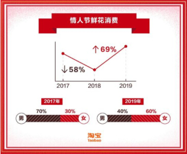 据淘宝数据显示,2017年,情人节鲜花消费中70%为男性;而仅仅过了2年,今年情人节鲜花消费群中有60%的女性。没有恋人,自己也能过节,如今在淘宝上,女性悦己文化正在日渐昌盛。