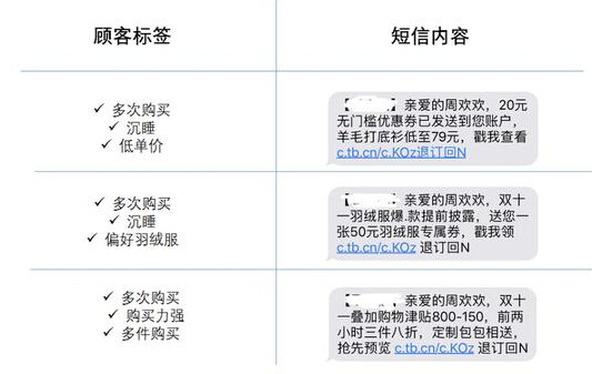 总之我们要根据消费者不同的购物习惯对消费者进行标签化,然后通过短信内容推送他们感兴趣的活动,提升他们的关注,从而增加点击率。