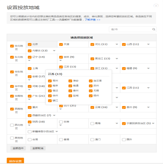 除港澳台、海外,其他通投;对于偏远地区可以根据个人情况选择性投放,快递无法到达,可不投; 部分行业可针对产品特性,所销售的宝贝是当地的特色,可不投放,如福建的鞋业,温州的皮具等; 季节、气候产品,针对性的投放地域,如冬季的棉服,可针对北方较冷的气候投放会更精准需求。