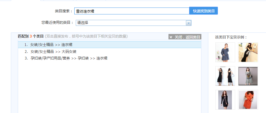 发布类目呢,我们不要输入大词,行业词。比如面膜,女装等等,我们定位输入的核心词应该是我们的主推关键词这样我们定位出来的类目才是最准确的类目。如果我们的定位不精准,选错了类目,会导致即使我们推起来人气,他的转化率依旧非常低。接下来我们输入雪纺连衣裙,快速找到类目,于是第一项女装/女士精品连衣裙就是最符合我们的类目,我们可以看右方的宝贝示例来做对比。