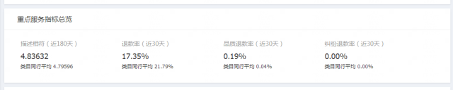 描述相符:这一评分是指最近180天内,买家给出的关于宝贝描述相符满意度的综合评分。所以从这个指标你可以直接看出你产品的品质情况,产品的品质问题是直接关系到这个指标的,而且你还可以看到同行平均值是多少,然后对比自己和同行的情况。