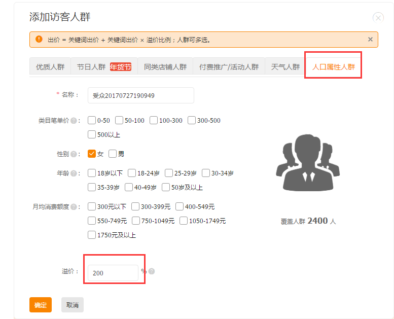 2.关键词推广下面精选人群,添加人群。添加访客人群,选择人口属性人群,根据上面自己生意参谋的访客分析来设置类目比单价,性别,年龄和月均消费额度。调整溢价,保留30%利润自己调整相应的溢价。