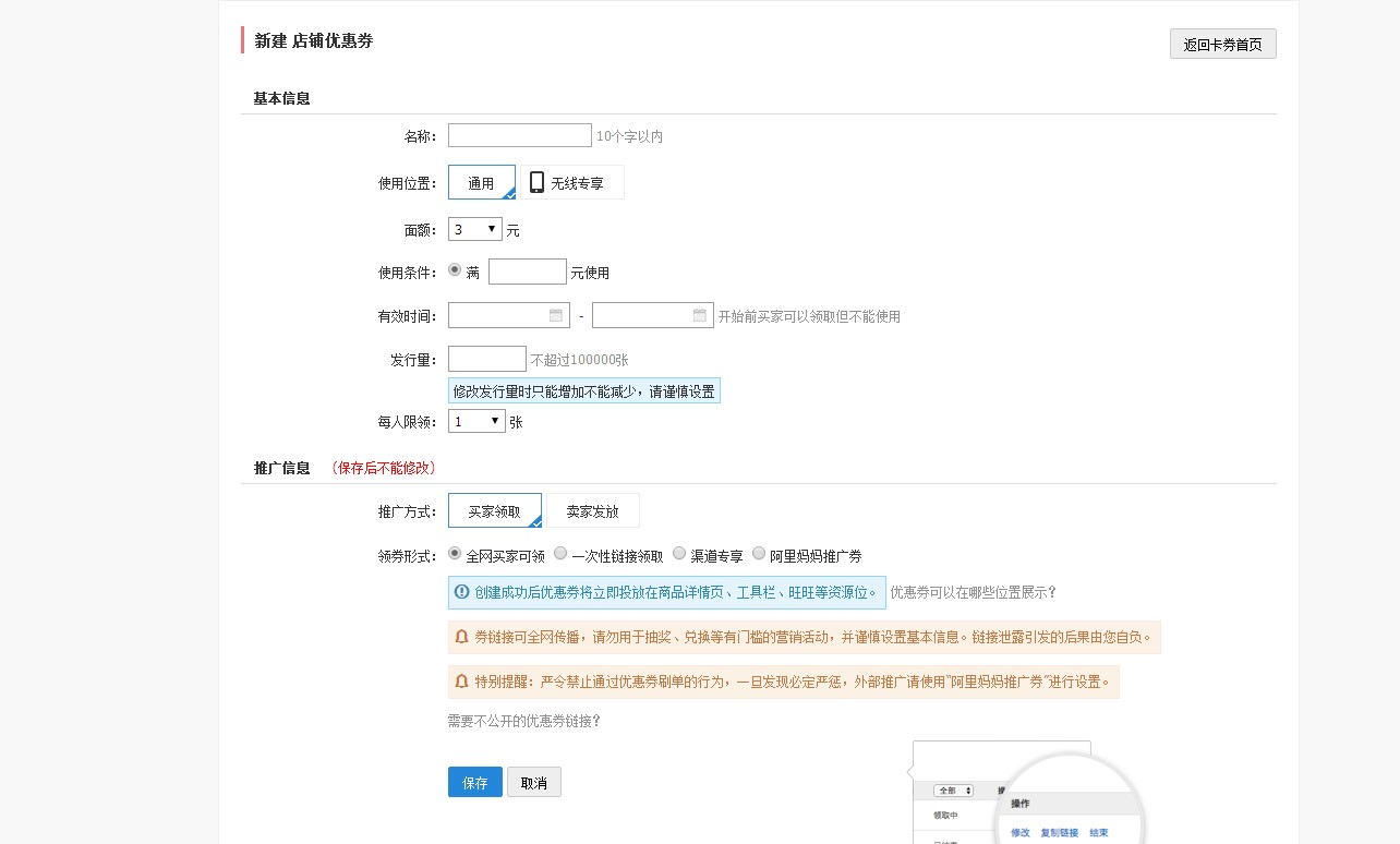 如图所示,填写优惠券的名称。通用是指在pc端和无线端都可以使用,而无线专享是指只能在无线端去使用的优惠券。在有效时间之前可以领券但不可以使用,只有在有效时间之内才可以使用。如果是买家自己领取的话,又分为全网买家领取意思就是只要进入店铺的买家都可以领取。还有就是一次性链接领取意思就是买家进入链接后只能领取一次。渠道专享的意思就是你的优惠券只能在被你授权指定的平台上领取。阿里妈妈推广券是指定的站外的推广渠道。我们一般就是选择每人限领一张。买家领取。全网买家可领。最后保存之后回到上一页,看你自己是想在详情页的页头展示还是详情页的页尾展示,但是我们一般选择是页头。这样的话更有吸引力。点击下一步,在这里就是选择你想要批量添加优惠券的宝贝,可以全选,但是最多是500个,也可以选择几个,那么同步之后优惠券就会展示在你所选的宝贝的详情页的头部。