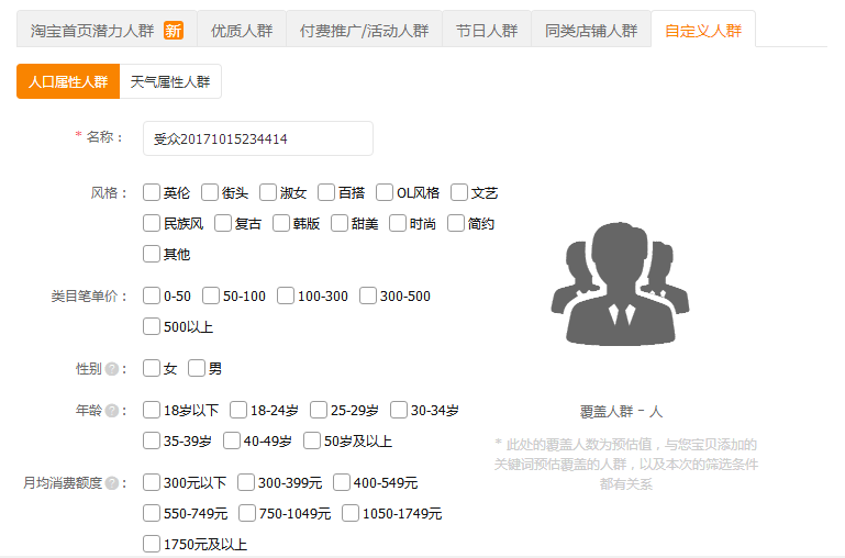 我们可以从风格、年龄、性别、类目笔单价和月经消费额度上去圈定符合自己宝贝的人群。