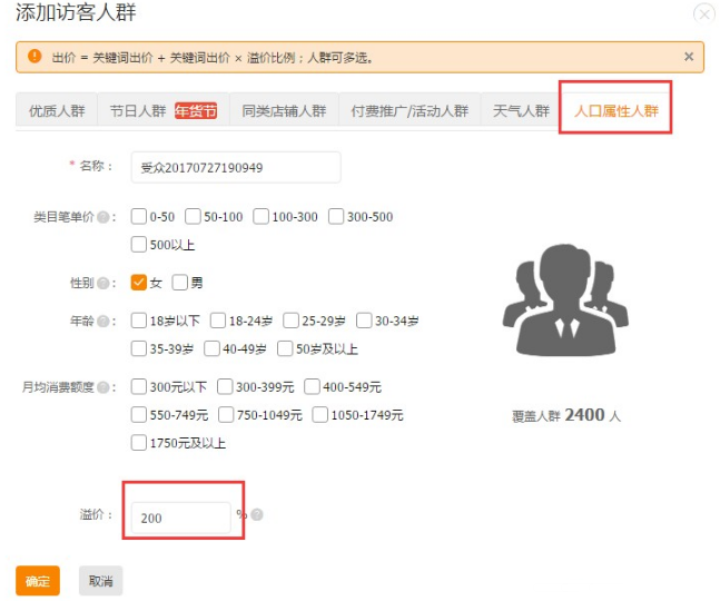 2.关键词推广下面精选人群,添加人群。添加访客人群,选择人口属性人群,根据上面自己生意参谋的访客分析来设置类目比单价,性别,年龄和月均消费额度。调整溢价,保留30%的利润,根据行业情况设置溢价。