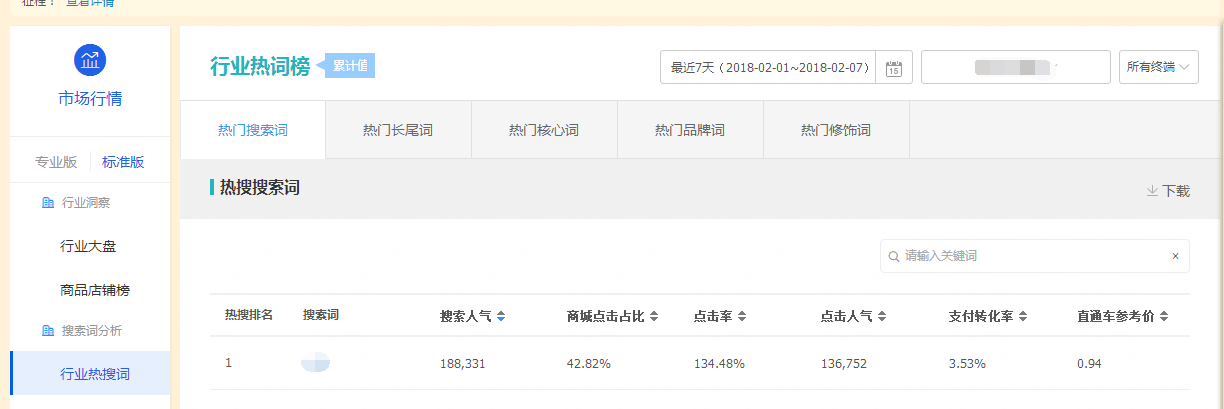 选择看最近7天或者30天的数据,类目选择正确,看行业热搜词