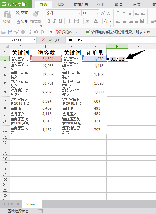 那么会用公式的同学就用表格公式进行计算,不会公式的同学就直接用计算器来算,也是一样的!在这里老师只是算出了这几个宝贝的转化率,那么同学们在操作过程中就要把这些转化率全部计算出来!那么我们通过这些数据的对比就可以发现,”跑步运动套装女”和”健身房运动套装女”这2个词的转化率是最高的,那我们把他标黄!同时把他们的访客数也标黄!