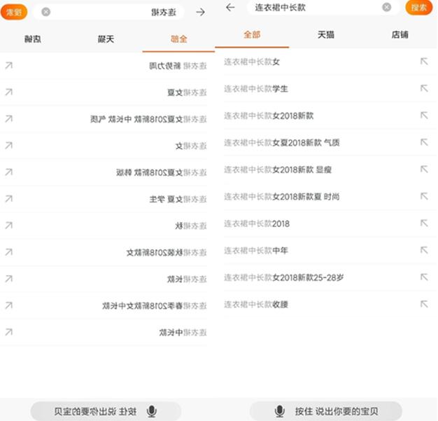 打开我们的手机淘宝,先搜索一个我们需要的大词,比如搜索连衣裙然后别点击搜索,这个时候你会发现下面有很多和连衣裙相关的词,比如连衣裙女夏、连衣裙中长款之类的,这些都是淘宝根据买家搜索的关键词里面含有连衣裙,并且推荐的是搜索量最大的关联词,我们需要把这些词里面适合我们的记录下来留着备用,然后从这些关键词里面找到最适合我们的词再搜索一下,还是不要点进去。这个时候会出现另外的推荐关键词。比如我们搜索连衣裙中长款这个词,出现的基本是长尾词并且都是和我们产品最贴近的关键词,这些词就可以直接用到直通车里面,因为这些词都是最能反映客户的需求并且流量也是很大的。